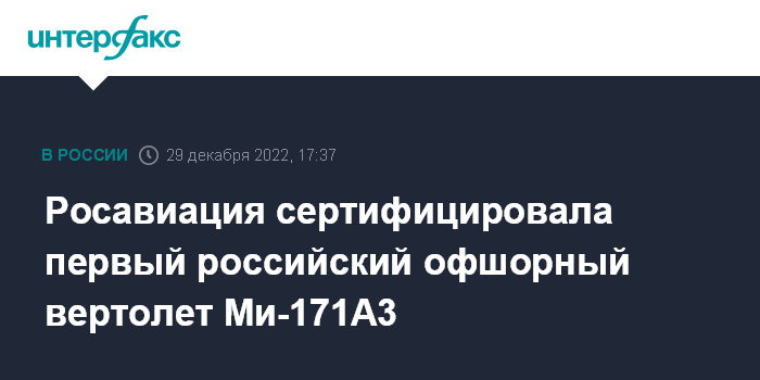 Москва. 29 декабря. INTERFAX.RU - Росавиация выдала сертификат типа на вертолет Ми-171А3, предназначенный для офшорных операций (перевозки пассажиров и грузов над морем) и обслуживания морских буровых платформ.
