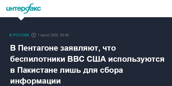 Москва. 1 июля. INTERFAX.RU - Американские ВВС используют беспилотные самолеты-шпионы над северо-восточными районами Пакистана для обеспечения пакистанских служб безопасности разведывательной информацией о деятельности талибов в этих регионах, сообщает телекомпания Си-Эн-Эн.