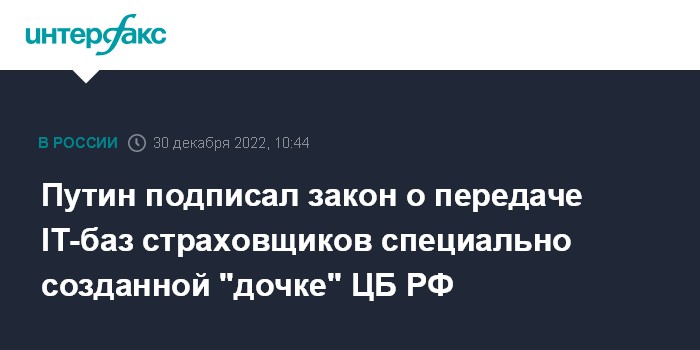 Москва. 30 декабря. INTERFAX.RU - Президент РФ Владимир Путин подписал закон о передаче IT-баз страховщиков специально созданному оператору, 100%-ной дочерней компании Банка России, сообщается на портале государственной правовой информации.