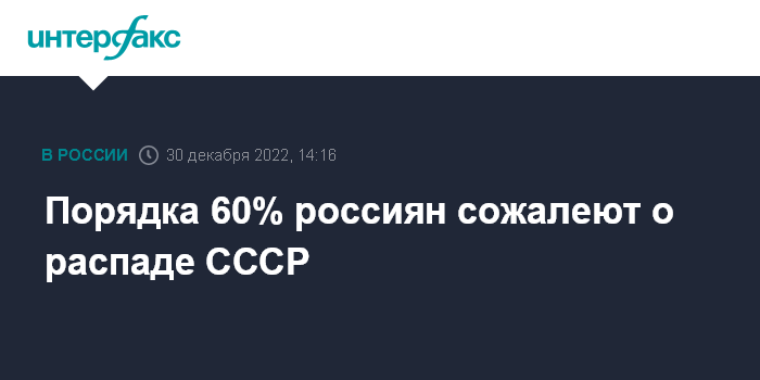 Москва. 30 декабря. INTERFAX.RU - Больше половины россиян (58%) испытывают чувство сожаления в связи с происшедшим более 30 лет назад распадом Советского Союза, свидетельствуют данные опроса ВЦИОМ, опубликованные в пятницу на сайте социологического центра.