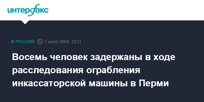 Москва. 1 июля. INTERFAX.RU - По делу об ограблении инкассаторской машины в Перми задержаны восемь человек, сообщил начальник ГУВД Пермского края Юрий Горлов в среду журналистам.