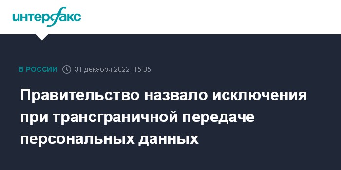 Москва. 31 декабря. INTERFAX.RU - Правительство утвердило перечень случаев, при которых трансграничная передача персональных данных не подпадает под ограничения, установленные новыми поправками к закону, и при которых не нужно будет уведомлять Роскомнадзор.