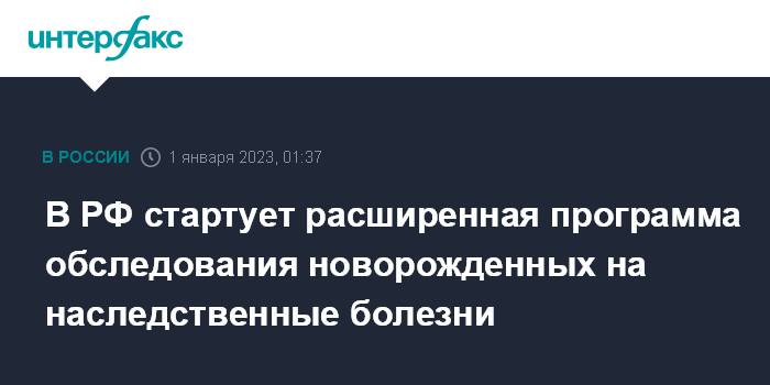 Москва. 1 января. INTERFAX.RU - Расширенная программа массового обследования новорожденных с целью выявления наследственных заболеваний (неонатальный скрининг) стартует 1 января 2023 года по всей России, планируется проводить обследования на более чем 40 заболеваний.