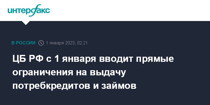 Москва. 1 января. INTERFAX.RU - ЦБ РФ с 1 января 2023 года вводит прямые ограничения на выдачу необеспеченных потребительских кредитов и займов.