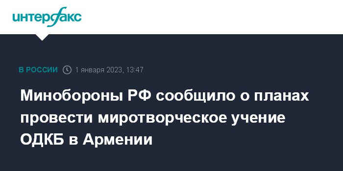 "За пределами Российской Федерации будет проведено совместное учение миротворческих контингентов ОДКБ "Нерушимое братство-2023" на территории Армении", - говорится в сообщении военного ведомства.