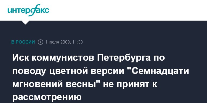 Москва. 1 июля. INTERFAX.RU – Гагаринский районный суд Москвы вернул коммунистам Петербурга и Ленинградской области иск о возмещении морального вреда в связи с выходом цветной версии фильма "Семнадцать мгновений весны".
