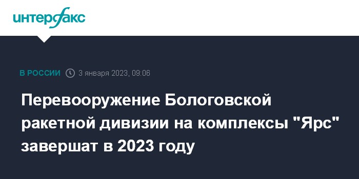 "В 2023 году постановкой на боевое дежурство очередного ракетного полка Бологовского соединения (Тверская область) ракетные войска стратегического назначения, в целом, завершат переоснащение мобильной группировки на подвижный грунтовый ракетный комплекс "Ярс", - говорится в сообщении.