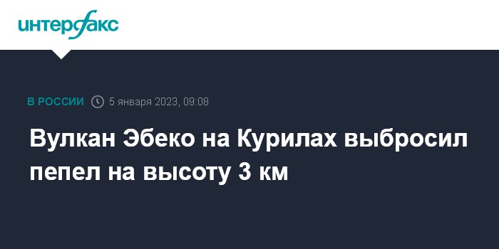 Москва. 5 января. INTERFAX.RU - Пепловый выброс на высоту 3 км над уровнем моря зарегистрирован днем в четверг на вулкане Эбеко, расположенном на северокурильском острове Парамушир (Сахалинская область), сообщает пресс-служба главного управления МЧС региона.