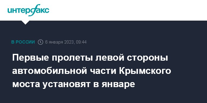 Москва. 6 января. INTERFAX.RU - Надвижка первых двух пролетов левой стороны автодорожной части Крымского моста поочередно будет выполнена в январе 2023 года, для этого будут дважды введены временные ограничения для движения автотранспорта, сообщила пресс-служба Росавтодора.
