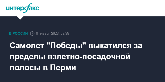 Москва. 8 января. INTERFAX.RU - Самолет авиакомпании "Победа" выкатился за пределы взлетно-посадочной полосы (ВПП) при разгоне в пермском аэропорту "Большое Савино", сообщает пресс-служба аэропорта в воскресенье.