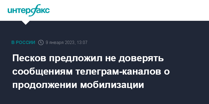 Москва. 9 января. INTERFAX.RU - Пресс-секретарь президента России Дмитрий Песков посоветовал не придавать большого значения сообщениям о продолжении мобилизации, которые появились в телеграм-каналах на новогодних праздниках. Его на брифинге попросили прокомментировать эти сообщения.