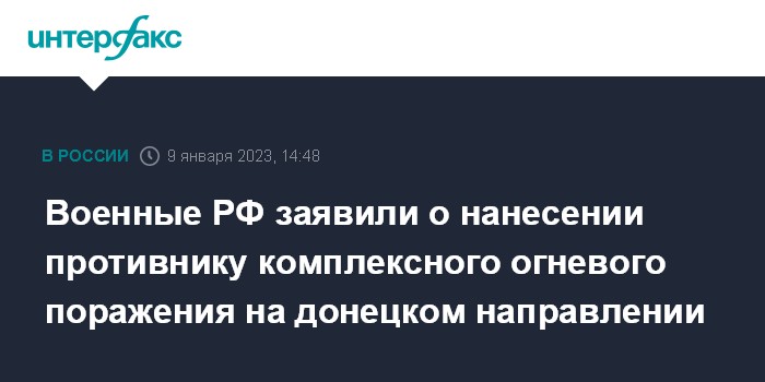 Москва. 9 января. INTERFAX.RU - Вооружённые силы России на донецком направлении наносят комплексное огневое поражение подразделениям украинской армии по всему участку линии боевого соприкосновения, сообщил официальный представитель министерства обороны РФ Игорь Конашенков.