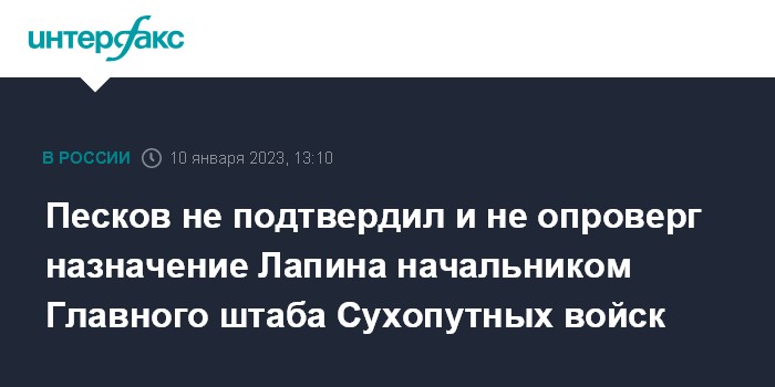 Москва. 10 января. INTERFAX.RU - Пресс-секретарь президента РФ Дмитрий Песков заявил, что не может ни подтвердить, ни опровергнуть сообщения о назначении генерал-полковника Александра Лапина начальником Главного штаба Сухопутных войск ВС РФ.