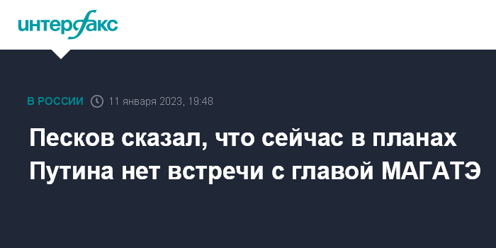 По просьбе "Интерфакса" в среду Песков прокомментировал слова Гросси, который заявил, что в скором времени надеется на встречу с Путиным. Пресс-секретарь ответил на вопрос о том, запланирована ли такая встреча в графике Путина.