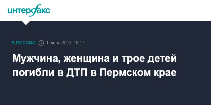 Нижний Новгород. 1 июля. INTERFAX.RU - Пять человек, в том числе трое детей, погибли в среду в результате ДТП в Пермском крае.