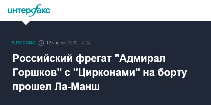 Москва. 12 января. INTERFAX.RU - Фрегат "Адмирал флота Советского Союза Горшков", вооруженный гиперзвуковыми ракетами "Циркон", завершил проход пролива Ла-Манш в южном направлении, сообщил Северный флот.