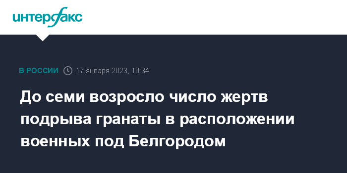 Москва. 17 января. INTERFAX.RU - Число погибших при взрыве в месте дислокации военнослужащих под Белгородом возросло до семи человек.