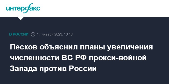 Москва. 17 января. INTERFAX.RU - Планируемое увеличение численности Вооруженных сил РФ связано с прокси-войной, которую коллективный Запад ведет против России, заявил пресс-секретарь главы российского государства Дмитрий Песков.