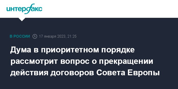 Всего в связи с прекращением членства РФ в Совете Европы предлагается считать прекратившими действие в отношении РФ с 16 марта 2022 года 21 международный договор, в том числе: Устав Совета Европы, генеральное соглашение о привилегиях и иммунитетах Совета Европы, Конвенцию о защите прав человека и основных свобод, Европейскую конвенцию о пресечении терроризма, Европейскую хартию местного самоуправления, Европейскую социальную хартию.