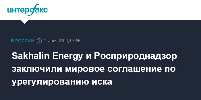 Южно-Сахалинск. 2 июля. ИНТЕРФАКС - ДАЛЬНИЙ ВОСТОК - Компания Sakhalin Energy и Росприроднадзор в среду заключили мировое соглашение об урегулировании иска данного ведомства к компании по взыскании с нее 390 млн рублей ущерба лесному фонду острова Сахалин, сообщили агентству "Интерфакс - Дальний Восток" в пресс-службе компании.