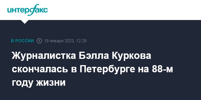 Москва. 19 января. INTERFAX.RU - Советская и российская журналистка Бэлла Куркова скончалась в Петербурге, сообщил "Интерфаксу" председатель Союза журналистов Петербурга и Ленинградской области Андрей Радин.