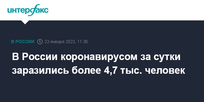 Москва. 23 января. INTERFAX.RU - Суточный прирост новых заболевших коронавирусной инфекцией в РФ составил более 4,7 тыс. случаев, скончался 41 пациент с COVID-19, следует из данных оперативного штаба, обнародованных в понедельник.