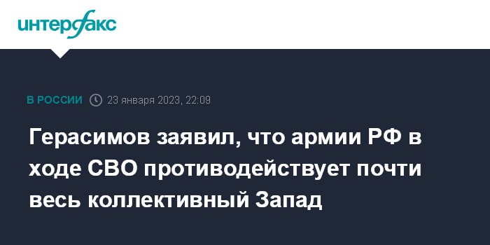 Москва. 23 января. INTERFAX.RU - Начальник российского Генштаба Валерий Герасимов заявил, что армии РФ в ходе специальной военной операции на Украине противодействует практически весь Запад.