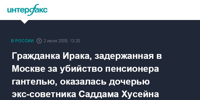 Москва. 2 июля. INTERFAX.RU - В Москве по подозрению в совершении убийства задержана гражданка Ирака, дочь бывшего советника казненного президента Саддама Хусейна, сообщил в четверг "Интерфаксу" источник в правоохранительных органах.