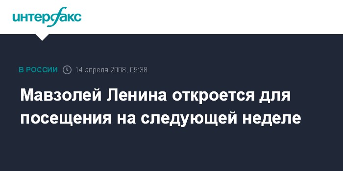Москва. 14 апреля. INTERFAX.RU - Мавзолей Владимира Ленина на Красной площади вновь откроется для посещения в среду, сообщил "Интерфаксу" руководитель Центра по связям с прессой и общественностью Федеральной службы охраны (ФСО) РФ Сергей Девятов.