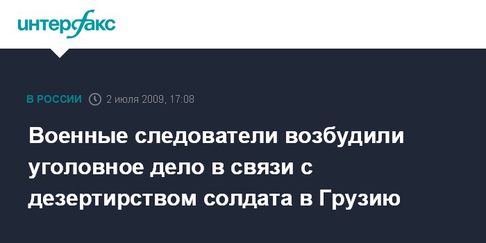 Москва. 2 июля. INTERFAX.RU - По факту дезертирства рядового российской армии Дмитрия Артемьева, ушедшего из Южной Осетии в Грузию, возбуждено уголовное дело. Как сообщили "Интерфаксу" источники в Северо-Кавказском военном округе, уголовное дело возбуждено военными следователями по статье 338 часть 2 (дезертирство с оружием), которая предусматривает наказание в виде лишения свободы на срок до 10 лет.