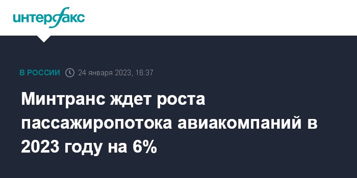 Москва. 24 января. INTERFAX.RU - В Минтрансе ожидают роста пассажиропотока авиакомпаний на 6% в 2023 году.