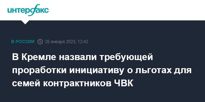 Москва. 25 января. INTERFAX.RU - В Кремле заявили, что инициатива по введению льгот для семей контрактников частных военных компаний (ЧВК) является новой и требует тщательной проработки со всеми ведомствами.