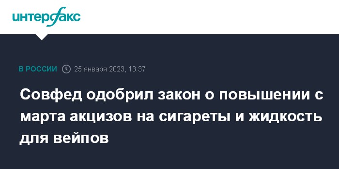 Москва. 25 января. INTERFAX.RU - Совет Федерации проголосовал за закон, который внепланово повышает акцизы на сигареты и папиросы в РФ с 1 марта 2023 года на 2%, на жидкость и табак для вейпов - на 11%.