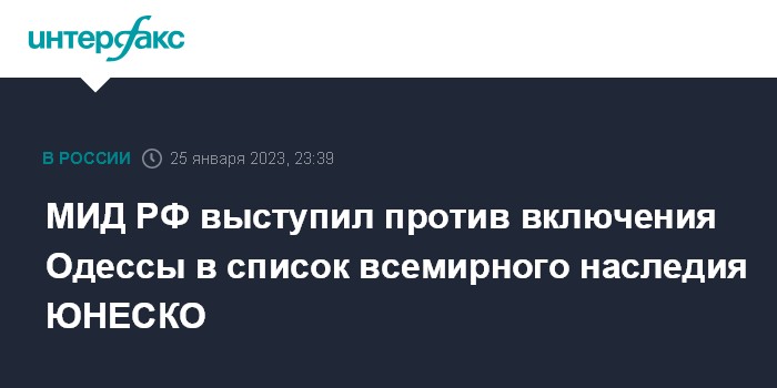 Москва. 25 января. INTERFAX.RU - Министерство иностранных дел России, комментируя для СМИ принятое на 18-й внеочередной сессии Комитета всемирного наследия ЮНЕСКО решение о включении в Список всемирного наследия, находящегося под угрозой, номинации "Исторический центр портового города Одессы", отметил его неподготовленность и политическую мотивированность.