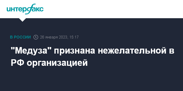 23 апреля 2021 года Минюст РФ внес в реестр СМИ - иностранных агентов издание Medusa Project ("Медуза"). Согласно реестру, "Медуза" является юридическим лицом, зарегистрированным в 2014 году в Латвийской Республике (SIA Medusa Project).