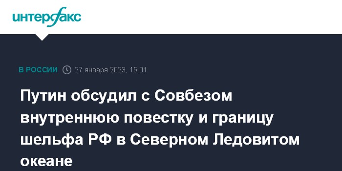 "Сегодня у нас несколько важных вопросов, касающихся внутренней повестки, и вопрос внешней границы континентального шельфа РФ в Северном Ледовитом океане", - сказал Путин в ходе оперативного совещания с членами Совбеза РФ.