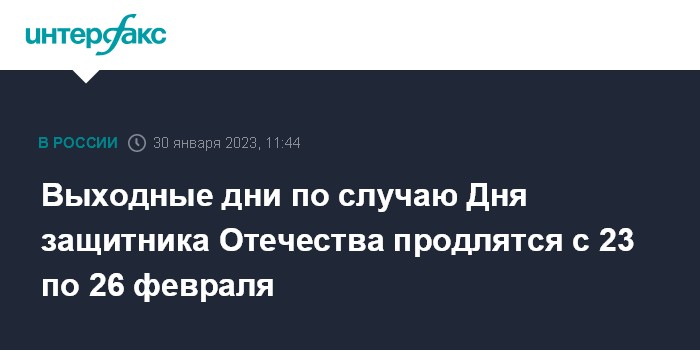 Москва. 30 января. INTERFAX.RU - Россиян ждет короткая рабочая неделя в конце февраля по случаю празднования Дня защитника Отечества, выходные продлятся с 23 по 26 февраля, сообщается в телеграм-канале Роструда в понедельник.