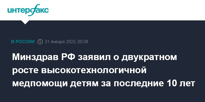 Москва. 31 января. INTERFAX.RU - В России с 2012 года объемы оказываемой детям специализированной высокотехнологичной медицинской помощи (ВМП) увеличились более чем в два раза, сообщили в Минздраве России.