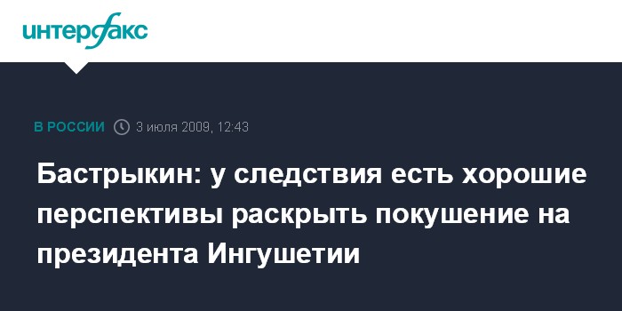 Москва. 3 июля. INTERFAX.RU - Следствие имеет хорошие шансы раскрыть покушение на президента Ингушетии Юнус-Бека Евкурова и убийство главы МВД Дагестана Адильгерея Магомедтагирова, заявил на пресс-конференции в центральном офисе "Интерфакса" глава СКП РФ Александр Бастрыкин.