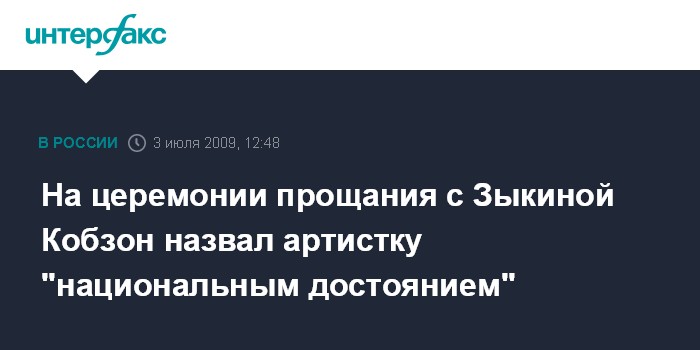 Москва. 3 июля. INTERFAX.RU – На церемонии прощания с народной артисткой СССР Людмилой Зыкиной, которая проходит в Москве в концертном зале имени Чайковского, выступил известный певец, а ныне еще и политик Иосиф Кобзон, который назвал Зыкину "национальным достоянием", а ее голос – "символом страны".