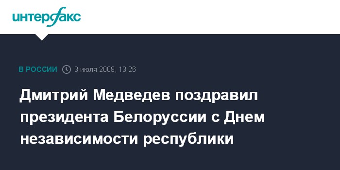 Москва. 3 июля. INTERFAX.RU - Президент России Дмитрий Медведев поздравил президента Белоруссии Александра Лукашенко с национальным праздником - Днем независимости, сообщает в пятницу в пресс-службе Кремля. "Примите поздравления по случаю национального праздника Белоруссии - Дня независимости. Особый, знаменательный характер этому событию придает празднование в этом году 65-й годовщины освобождения Белоруссии от немецко-фашистских захватчиков", - говорится в поздравлении главы Российского государства.