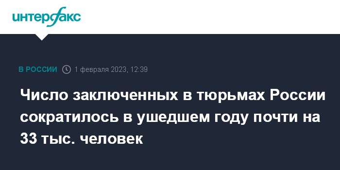 Москва. 1 февраля. INTERFAX.RU - Количество заключенных в российских исправительных колониях и следственных изоляторах (СИЗО) уменьшилось в прошлом году на 32,9 тыс. человек, что сопоставимо с 2019-2020 годами, следует из данных федеральной службы исполнения наказаний (ФСИН).