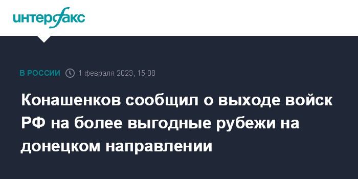 Москва. 1 февраля. INTERFAX.RU - Российские войска заняли более выгодные рубежи в ходе наступления на донецком направлении, сообщил официальный представитель министерства обороны РФ Игорь Конашенков на брифинге в среду.