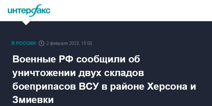 Москва. 2 февраля. INTERFAX.RU - Два склада боеприпасов вооружённых сил Украины (ВСУ) уничтожены ударами российской артиллерии в районе Херсона и Змиевки Херсонской области, сообщил официальный представитель министерства обороны РФ Игорь Конашенков.