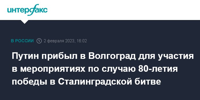 Москва. 2 февраля. INTERFAX.RU - Президент РФ Владимир Путин прибыл в Волгоград, где он посетит ряд мемориальных мероприятий по случаю 80-летия победы в Сталинградской битве.