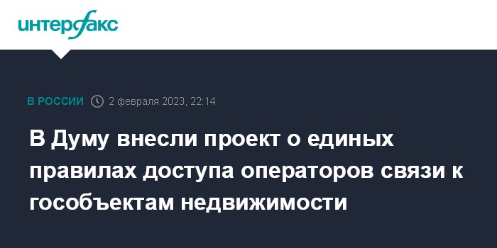Москва. 2 февраля. INTERFAX.RU - Правительство РФ внесло в Госдуму законопроект об установлении единых правил доступа операторов связи к государственным, региональным и муниципальным объектам недвижимости для размещения на них сетей связи. Документ (№289020-8) размещен в электронной базе данных парламента.