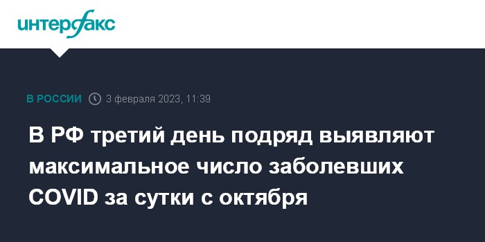 Москва. 3 февраля. INTERFAX.RU - Суточный прирост новых случаев COVID-19 в РФ впервые с конца октября 2022 года превысил 9,6 тыс. заболевших, скончались 46 пациентов с коронавирусом, следует из данных оперативного штаба, обнародованных в пятницу.