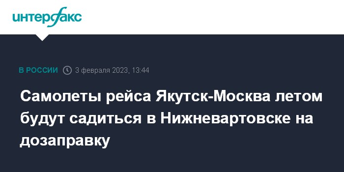 Москва. 3 февраля. INTERFAX.RU - Аэропорт Нижневартовска летом 2023 года будет принимать на дозаправку пассажирские рейсы из Якутска в Москву, Санкт-Петербург и Сочи. Об этом говорится в официальном телеграм-канале Нижневартовска.