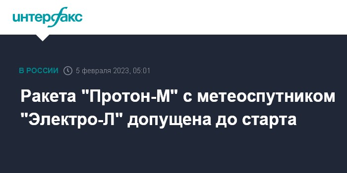 Москва. 5 февраля. INTERFAX.RU - Государственная комиссия подтвердила готовность к пуску в воскресенье ракеты-носителя "Протон-М" с гидрометеорологическим спутником "Электро-Л" № 4, сообщили в "Роскосмосе".