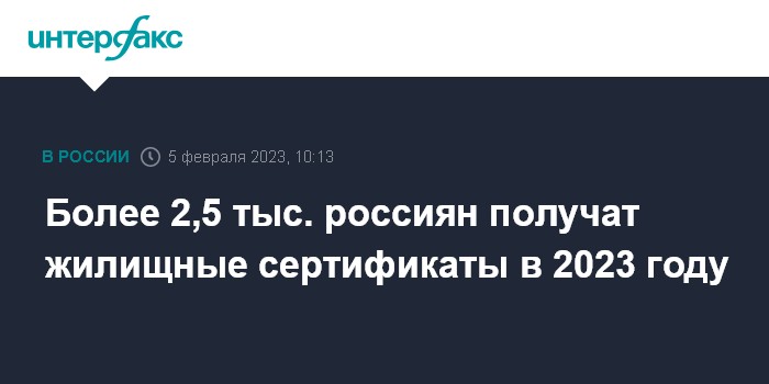 Москва. 5 февраля. INTERFAX.RU - Более 2,5 тыс. россиян в 2023 году смогут получить сертификаты на приобретение жилья за счет средств федерального бюджета, на эту меру поддержки предусмотрено почти 12 млрд рублей, сообщает правительство РФ в воскресенье.